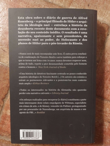 Esta obra sobre o diário de guerra de Alfred Rosenberg - o principal filósofo de Hitler e arquiteto da ideologia nazi - entrelaça a história da descoberta recente deste documento com a revelação do seu conteúdo inédito. O resultado é uma narrativa, apaixonante e sem precedentes, da ascensão nazi ao poder, do Holocausto e dos planos de Hitler para o pós-invasão da Rússia. O livro contextualiza habilmente mais de 400 páginas de entradas de um diário que se estende de 1936 a 1944, em que o leal conselheiro de Hitler relata as suas reuniões com o Führer e os seus cúmplices Hermann Göring e Heinrich Himmler; descreve os planos de ocupação da União Soviética; reflete sobre a «solução» para a «questão judaica»; e discute a fiscalização do roubo e catalogação de livros e obras de arte de casas particulares, bibliotecas e museus da Europa.
