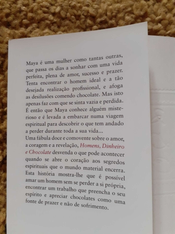 Uma fábula doce e comovente sobre o amor, a coragem e a revelação, Homens, Dinheiro e Chocolate desvenda o que pode acontecer quando se abre o coração aos segredos espirituais que o mundo material encerra. Esta história mostra-lhe que é possível amar um homem sem ser perder a si própria, encontrar um trabalho que preencha o seu espírito e apreciar chocolates como uma fonte de prazer e não de sofrimento.