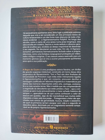 "A Regra de Quatro" divide-se em dois momentos cruciais. Um primeiro, em que os leitores têm de decifrar cinco enigmas sequenciados de diferentes áreas do saber. E um segundo momento em que a mensagem está codificada nos quatro pontos cardiais que representam as coordenadas geográficas para chegar à cripta, procurada por muitos, onde se encontram peças de arte de valor incalculável. Através de uma escrita de grande qualidade criativa, o leitor fica envolvido num ambiente de genialidade, loucura, traição e assassínio.