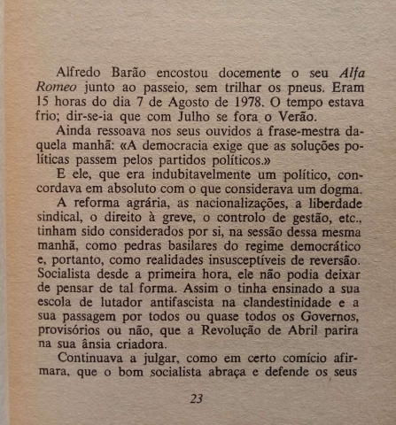 "Savi Dadú Kabi, doutor em Filologia Clássica por Oxford e, realmente, um homem inteligente e pertinaz, bocejou quase com elegância, pousou sobre o papel colocado à sua frente a caneta de ouro que lhe oferecera o príncipe Carlos e apurou o ouvido, em direcção ao aparelho de rádio, de caixa de sândalo.