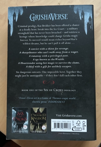 “Six of Crows" É sobre um assalto impossível liderado por Kaz Brekker, um prodígio criminoso, a um refúgio impenetrável. Ele reúne uma equipa de seis renegados - um atirador, um especialista em explosivos, uma espiã, um fugitivo e uma grisha - para roubar um cientista com conhecimento vital. O destino do mundo está em jogo se não conseguirem concluir a missão e sobreviver um ao outro.