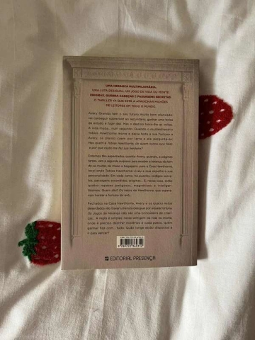 Estamos tão espantados quanto Avery, quando, a páginas tantas, vem a segunda surpresa: para receber a herança, ela tem de se mudar, de malas e bagagens, para a Casa Hawthorne, local onde Tobias Hawthorne viveu e que espelha a sua personalidade. Em cada canto, há puzzles, códigos secretos, passagens escondidas, enigmas… E, nessa casa, estão quatro rapazes perigosos, magnéticos e inteligentíssimos. Quem são? Os netos de Hawthorne, que esperavam herdar a fortuna do avô…