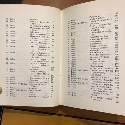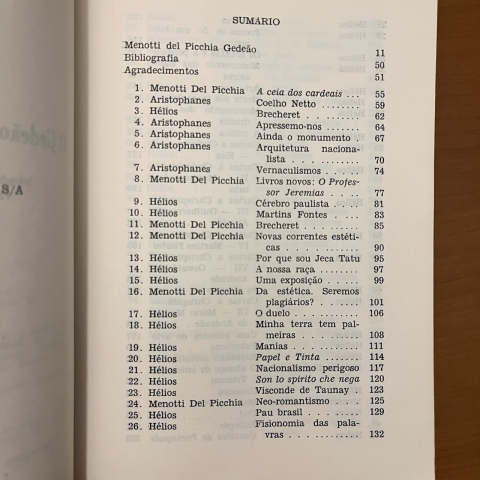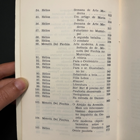 Crónicas de Menotti del Picchia e do seu pseudónimo Hélios acerca do modernismo brasileiro: Coelho Netto, "Pau Brasil" de Oswald de Andrade, Mário de Andrade, o futurismo paulista, Semana de Arte Moderna, etc.
