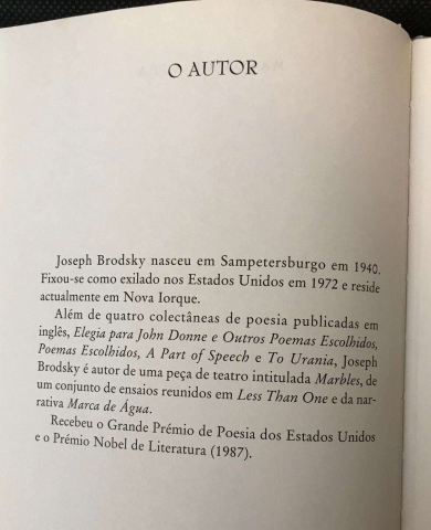 Joseph Brodsky é um poeta russo de família judia, naturalizado norte-americano, premio Nobel da Literatura em 1987.