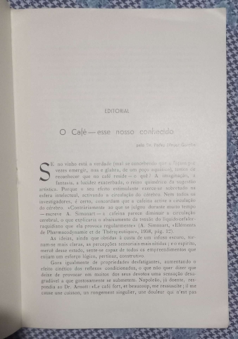 Separata, pequena em tamanho, grande no seu conteúdo e procura. Dr Mayer Garção, disseca o que é o Café na nossa sociedade e projeta o seu começo no Iémen, após um abade maometano reparar que as cabras ficavam embriagadas em euforia, quando comiam uns frutos de cor vermelho coral, de um arbusto que crescia na escarpa. O abade colheu alguns desses frutos, fez uma infusão com eles, provou, deu a beber a outras pessoas e todos sentiram uma modificação, semelhante à embriaguez, um alegre vigor, uma sensação de clareza.