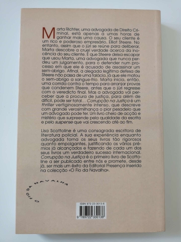 Marta Richter, uma advogada de Direito Criminal, está apenas a umas horas de ganhar mais uma causa. O seu cliente é um rico e poderoso empresário, Elliot Steere. No entanto, assim que o júri se reúne para deliberar, Marta descobre a cruel verdade acerca da inocência do seu cliente. É que Steere deixa escapar que usou Marta, uma advogada que nunca perdeu um julgamento, para o defender num processo em que ele é acusado de assassinar um sem-abrigo a sangue-frio. Marta inicia, então, uma corrida contra o tempo para arranhar provas que condenem Steere, antes que o júri regresse com o veredicto final. Mas a advogada vai perceber que a procura de justiça, para além de difícil, pode ser fatal...Corrupção na Justiça é um thriller vertiginosamente intenso, que descreve com grande verosimilhança o pior pesadelo que um advogado pode ter. Um livro cheio de acção e mistério que surpreende pela qualidade de escrita e pelo suspense que vai crescendo até ao fim.