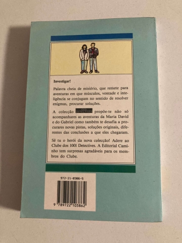 Sinopse: A colecção 1001 Detectives propõe-te, não só acompanhares as aventuras da Maria David e do Gabriel, como também te desafia a procurares novas pistas, soluções originais, diferentes das conclusões a que eles chegaram.