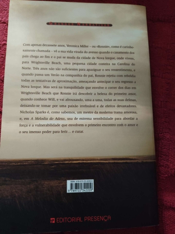 Com apenas dezassete anos, Verónica Miller - ou «Ronnie», como é carinhosamente chamada - vê a sua vida virada do avesso quando o casamento dos pais chega ao fim e o pai se muda da cidade de Nova Iorque, onde vivem, para Wrightsville Beach, uma pequena cidade costeira na Carolina do Norte. Três anos não são suficientes para apaziguar o seu ressentimento, e quando passa um Verão na companhia do pai, Ronnie rejeita com rebeldia todas as suas tentativas de aproximação, ameaçando antecipar o seu regresso a Nova Iorque. Mas será na tranquilidade que envolve o correr dos dias em Wrightsville Beach que Ronnie irá descobrir a beleza do primeiro amor, quando conhece Will, e vai afrouxando, uma a uma, todas as suas defesas, deixando-se tomar por uma paixão irrefreável e de efeitos devastadores. Nicholas Sparks é, como sabemos, um mestre da moderna trama amorosa, e, em A Melodia do Adeus, usa de extrema sensibilidade para abordar a força e a vulnerabilidade que envolvem o primeiro encontro com o amor e o seu imenso poder para ferir… e curar.