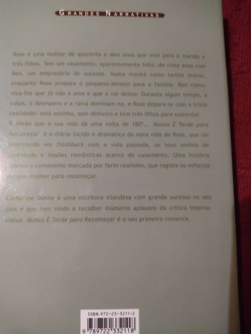 Rose é uma mulher de quarenta e dois anos que vive para o marido e para os três filhos. Tem um casamento, aparentemente feliz, de vinte anos com Ben, um empresário de sucesso. Numa manhã como tantas outras, enquanto Rose prepara o pequeno-almoço para a família, Ben comunica-lhe que já não a ama e que a vai deixar. Durante algum tempo, a culpa, o desespero e a raiva dominam-na, mas Rose depara-se com a triste realidade: está sozinha, sem dinheiro e tem três filhos para sustentar. É então que a sua vida dá uma volta de 180º... "Nunca É Tarde para Recomeçar" é o diário lúcido e dramático da nova vida de Rose, que vai alternando em flashback com a vida passada, dos seus sonhos de juventude e ilusões românticas acerca do seu casamento. Uma história intensa e comovente marcada por um forte realismo, que regista os esforços de uma mulher para recomeçar.