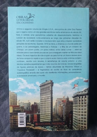 1919 é o segundo volume da trilogia U.S.A., obra-prima de John Dos Passos que o sagrou como um dos grandes escritores norte-americanos do século XX. Nela é exibida uma panorâmica soberba do desenvolvimento histórico e cultural da sociedade norte-americana ao longo das primeiras décadas do século XX, num estilo inovador e revolucionário que viria a inspirar sucessivas gerações de escritores. Quando 1919 se inicia, a América e o mundo estão em guerra, e as personagens, históricas e fictícias, vêem-se atiradas para o caos sendo poucas as que conseguem manter-se fiéis aos seus ideais. Os seus trajectos de vida cruzam-se para formar uma «crónica contemporânea», escrita com recurso, à semelhança do volume anterior, a uma técnica narrativa experimental que inclui recortes de notícias, breves biografias de figuras públicas da época e fragmentos de escrita de fluxo de consciência autobiográfico através dos quais vão desfilando informações, personalidades, a sociedade americana, o mundo.