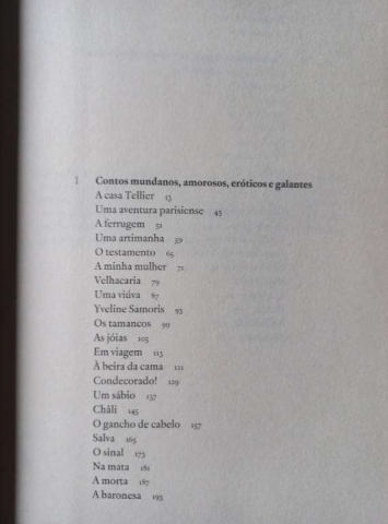 Da vasta obra literária que o autor nos deixou, foram escolhidos quarenta e dois contos, divididos em três partes: «Contos mundanos, amorosos, eróticos e galantes», «Contos inquietantes, de horror e de mistério» e «Contos exemplares».