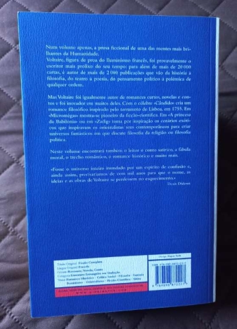 Com o célebre Cândido cria um romance filosófico inspirado pelo terramoto de Lisboa, em 1755. Em Micromégas mostra-se pioneiro da ficção-científica. Em A princesa da Babilónia ou em Zadig toma por inspiração os cenários exóticos que inspiravam os orientalistas seus contemporâneos para criar universos fantásticos em que discute filosofia da religião ou filosofia política. Mas neste volume encontrará também o leitor o conto satírico, a fábula moral, o trecho romântico, o romance histórico e muito mais.