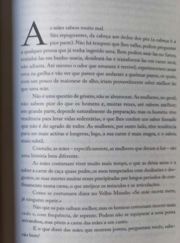 Antes do último suspiro, a mãe deste romance sussurra: Come-me. Os filhos da família Seltzer sabiam que ela o faria, mas não deixa de ser um último desejo desagradável, cruel até. Os doze irmãos Seltzers são canibais americanos, em tempos uma minoria étnica orgulhosa e florescente. Vão confrontar-se com os seus paradoxos, tradição, culpa, conflitos fraternais e a quantidade descomunal de carne que há para comer - e que sabe mal, porque «as mães sabem muito mal».
