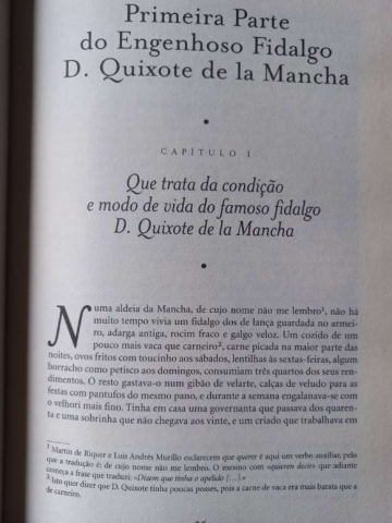 "Depois dos perigos da guerra, dos tormentos de um longo cativeiro, Cervantes suportou cerca de dez anos de viagens por terras ermas e incómodas, miseráveis e de clima rigoroso, de pobreza e dificuldades para o exercício da sua vocação de escritor, pois nesses anos não conseguiu mais que publicar umas poucas poesias avulsas. Em contrapartida, a sua experiência e o seu conhecimento da Espanha (das suas cidades, vilas e aldeias, da linguagem falada em lugares isolados que preservavam as palavras de outros tempos) enriquece-se profundamente: contacta com a trama das relações entre os diversos estratos sociais, desvenda a complexidade dos sentimentos e dos interesses, sonda os abusos dos poderes (político, religioso, económico, militar), sofre a hipocrisia e a duplicidade dos grandes e dos pequenos, assiste às mudanças que se vão operando na sociedade que resvala na decadência que com força crescente mina a nação. [...] Quanto à minha tradução, que não fiz para comemorar os quatrocentos anos da publicação deste livro que me acompanha desde há muito tempo, fi-la sobretudo para melhor poder saborear esta obra querida, não no seu original mas em algo que também é meu. Pretendi servir o livro traduzido, cingindo-me muito à sua letra, que cifra o seu espírito, o que não foi fácil nem isento de dúvidas e receios: Cervantes não quis dar à sua prosa a dignidade do latim que Góngora pretendeu para a sua poesia, antes quis seguir o conselho que o amigo lhe dá no Prólogo da Primeira Parte: «[...] só procurar que de modo simples, com palavras claras, honestas e bem colocadas, saia a vossa prosa e período harmonioso e festivo, pintando em tudo o que conseguirdes e for possível, a vossa intenção; dando a entender os vossos conceitos sem enredá-los nem obscurecê-los. »" Da nota introdutória.