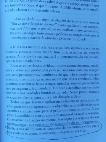 As técnicas de concentração mental do Dr. Murphy são baseadas num princípio muito simples: quando acreditamos numa coisa, sem reservas ou hesitações, e a visualizamos na nossa mente, removeremos os obstáculos inconscientes que nos impedem de atingir os resultados desejados - e as nossas crenças tornam-se realidade. Enquanto precursor daquilo que hoje se conhece como A Lei da Atração, o Dr. Murphy demonstra que qualquer pessoa consegue aceder aos extraordinários poderes mentais existentes dentro de si para construir autoconfiança, criar relacionamentos harmoniosos, atingir o sucesso profissional, acumular riquezas, ultrapassar fobias e medos e viver uma vida de felicidade e bem-estar
