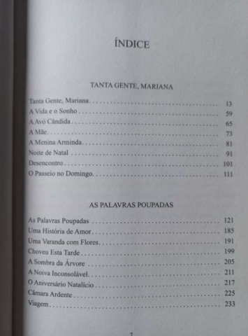 Este primeiro volume inclui as duas primeiras coletâneas de contos de Maria Judite de Carvalho: Tanta Gente, Mariana (1959) e As Palavras Poupadas (1961), Prémio Camilo Castelo Branco.