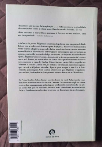 Os Peixes Também Sabem Cantar, escrito depois de Gente Independente, é um dos livros mais marcantes da obra de Laxness. Um romance mágico e comovente sobre a passagem da infância para a vida adulta numa Islândia em pleno século XIX que vai deixando para trás a sua misteriosa e ancestral sociedade e, timidamente, enfrenta o progresso e o desencanto da modernidade.