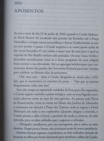 Aos poucos, porém, o aristocrata descobre aliados no hotel, com quem partilha o seu amor pelo belo - e a defesa de valores morais que nenhuma ideologia poderá vergar. Faz-se amigo do chef, dos porteiros, do barbeiro, do encarregado da garrafeira, e com eles conspira para devolver ao Metropol a sua antiga e majestosa glória. Ao mesmo tempo, toma sob a sua proteção uma menina desamparada, a quem provará que a vida não se resume à luta de classes.