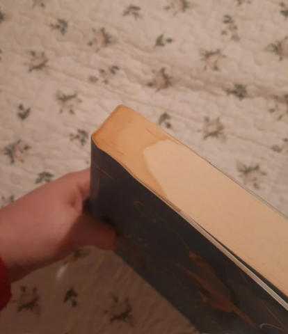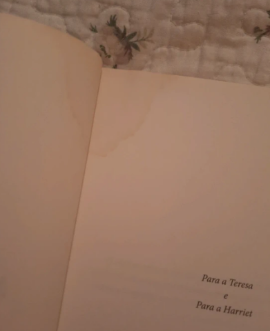- A 3ª imagem do carrossel de fotos mostra o defeito do livro, tem uma mancha de água e a 4ª imagem mostra como essa mancha afeta as páginas.