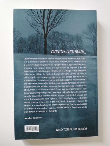 Unanimemente considerado um dos mestres actuais do policial, Ken Follett tem a capacidade única de, a cada novo romance, reinventar o próprio thriller. Em A Ameaça, um poderoso agente antiviral desaparece misteriosamente das instalações da Oxenford Medical, uma empresa farmacêutica que está a desenvolver um antivírus para uma das mais perigosas variedades do Ébola. Quem o poderá ter roubado? E com que obscuras intenções? Toni Gallo, responsável pela segurança da empresa, está profundamente consciente da terrível ameaça que o seu desaparecimento pode significar. Mas o que Toni, Stanley Oxenford, o director da empresa, e a própria polícia vão encontrar pela frente é um pesadelo capaz de ultrapassar os seus piores receios… Traições, violência, heroísmo e paixão num thriller absolutamente brilhante.