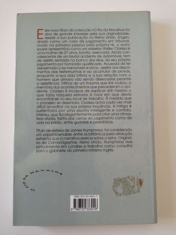 Este novo título da colecção «O Fio da Navalha» foi alvo de grande interesse pela sua originalidade, desde a sua publicação no Reino Unido. Engendrado como um caso de julgamento em tribunal, vivido na primeira pessoa pela própria ré, o autor soube apresentá-lo como um soberbo thriller. Clarissa é uma mulher de 27 anos, bonita, reservada. Ainda convalescente de um brutal acidente de automóvel, tem de assistir, sentada no banco dos réus, ao seu próprio julgamento por homicídio qualificado. Acusada de ter assassinado o ex-namorado e sócio, assiste aos depoimentos das testemunhas e ao acumular de provas, enquanto a sua vida íntima e a sua relação com o homem que amava vão sendo dissecadas perante a assistência. Vítima de um trauma que lhe roubou a memória dos acontecimentos que precederam o acidente, Clarissa é incapaz de explicar até mesmo o que fazia naquela estrada à hora em que em devia encontrar-se no seu local de trabalho. À medida que o processo se desenrola, Clarissa acha cada vez mais difícil acreditar na sua própria inocência. A intriga é sustentada por uma escrita inteligente e contida, intensa, que flui elegantemente para criar uma atmosfera vívida, tanto das cenas do julgamento como da vida na prisão, entre guardas e presidiárias.