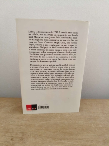 De repente, às nove e meia da manhã, a cidade começa a tremer. Com uma violência nunca vista, a terra esventra-se, as casa caem, os tectos das igrejas abatem, e o caos gera-se, matando milhares. Nas horas seguintes, uma onda gigante submerge o terreiro do Paço e durante vários dias incêndios colossais vão atemorizar a capital do reino. Perdidos e atordoados, os sobreviventes andam pelas ruas, à procura dos seus destinos. Enquanto Sebastião José de Carvalho e Melo tenta reorganizar a cidade, um pirata e uma freira tentam fugir da justiça, um inglês tenta encontrar o seu dinheiro e um rapaz de doze anos tenta encontrar a sua irmã gémea, soterrada nos escombros.