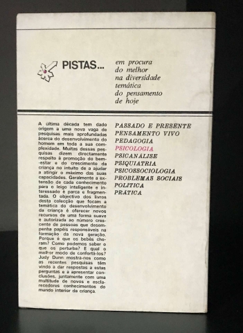 Porque é que os bebés choram? Como podemos saber o que os perturba? E qual o melhor modo de confortá-los? Judy Dunn mostra-nos como as pesquisas têm vindo a dar resposta a estas perguntas e a apresentar conclusões, juntamente com uma multitude de esclarecedores conhecimentos do mundo interior da criança.