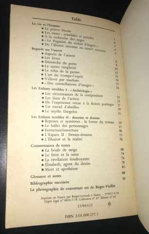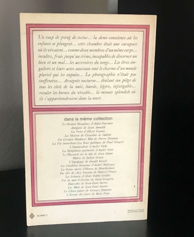 Un coup de poing de statue... la demi-conscience où les enfants se plongent... cette chambre était une carapace où ils vivaient... comme deux membres dun même corps... incultes, frais jusquau crime, incapables de discerner un bien et un mal... les accessoires du songe... Les êtres singuliers et leurs actes asociaux sont le charme dun monde pluriel qui les expulse... La photographie nétait pas inoffensive... Araignée nocturne... étoilant son piège de tous les côtés de la nuit, lourde, légère, infatigable... reculer les bornes du vivable... la minute splendide où ils sappartiendraient dans la mort.