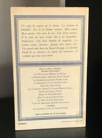 Un coup de crayon sur le clavier... La sonatine de Diabelli... Un cri de femme retentit... Mon amour. Mon amour... Un verre de vin... Une sirène retentit... Il la visée au cur comme elle le lui demandait... Parlez-moi... Une fleur blanche de magnolia... Les troènes crient... Inventez... Jamais vous navez crié... Un canard mort dans son linceul dorange... Le désordre blond de ses cheveux... Le même rite mortuaire... Je voudrais que vous soyez morte.