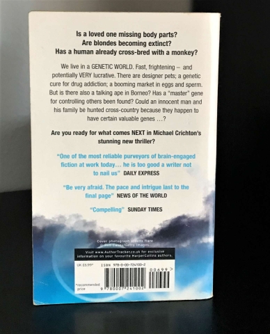 We live in a GENETIC WORLD. Fast, frightening and potentially VERY lucrative. There are designer pets; a genetic cure for drug addiction; a booming market in eggs and sperm. But is there also a talking ape in Borneo? Has a 'master' gene for controlling others been found? Could an innocent man and his family be hunted cross-country because they happen to have certain valuable genes