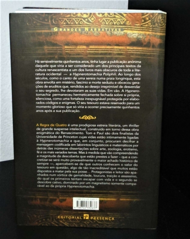 "A Regra de Quatro" divide-se em dois momentos cruciais. Um primeiro, em que os leitores têm de decifrar cinco enigmas sequenciados de diferentes áreas do saber. E um segundo momento em que a mensagem está codificada nos quatro pontos cardiais que representam as coordenadas geográficas para chegar à cripta, procurada por muitos, onde se encontram peças de arte de valor incalculável. Através de uma escrita de grande qualidade criativa, o leitor fica envolvido num ambiente de genialidade, loucura, traição e assassínio, dominado por um magnetismo apenas comparável ao do próprio Hypnerotomachia Poliphili.