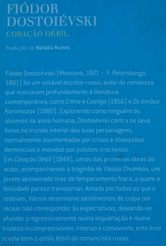 Coração Débil" (também conhecido como "Coração Fraco") é um conto de Fiódor Dostoiévski sobre Vássia Chumkov, um jovem funcionário que se deixa paralisar pelas suas próprias emoções e inseguranças. A história explora a fragilidade humana, a incapacidade de lidar com a felicidade e o conflito entre o sonho e a realidade, culminando na sua ruína profissional e pessoal.