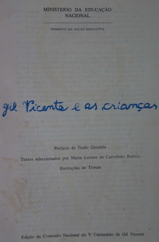 Observações: Edição da Comissão Nacional do V Centenário de Gil Vicente; Com uma seleção de textos selecionados por Maria Leonor de Carvalhão Buescu que pudesse agradar em simultâneo ao público infanto-juvenil e ao ideário do Estado Novo organizador das comemorações.