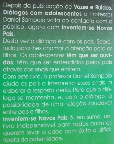 Depois da publicação de" Vozes e Ruídos". "Diálogos com adolescentes" o professor Daniel Sampaio volta ao contacto com o público, agora com «Inventem-se Novos Pais. Desta vez o diálogo é com os pais. Sobretudo para lhes chamar a atenção para os filhos. Os Adolescentes têm de ser ouvidos, têm de ser entendidos pelos pais através de sinais que emitem. Com este livro, o professor Daniel Sampaio ajuda os pais a interpretar esses sinais, a elaborar a resposta certa. Para que o diálogo se mantenha, e, com o diálogo, a possibilidade de uma relação saudável entre pais e filhos. "Inventem-se Novos Pais" é, em suma, um livro indispensável para todos quantos querem levar a cabo com êxito a difícil tarefa da paternidade.