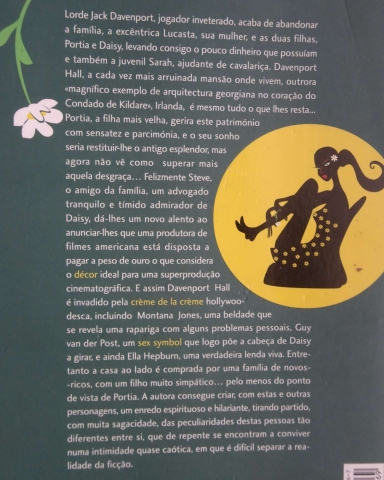 Lorde Jack Davenport, jogador inveterado, acaba de abandonar a família, a excêntrica Lucasta, sua mulher, e as duas filhas, Portia e Daisy, levando consigo o pouco dinheiro que possuíam e também a juvenil Sarah, ajudante de cavalariça. Davenport Hall, a cada vez mais arruinada mansão onde vivem, outrora "magnífico exemplo de arquitectura georgiana no coração do Condado de Kildare", Irlanda, é mesmo tudo o que lhes resta... Portia, a filha mais velha, gerira este património com sensatez e parcimónia, e o seu sonho seria restituir-lhe o antigo esplendor, mas agora não vê como superar mais aquela desgraça Felizmente Steve, o amigo da família, um advogado tranquilo e tímido admirador de Daisy, dá-lhes um novo alento ao anunciar-lhes que uma produtora de filmes americana está disposta a pagar a peso de ouro o que considera o décor ideal para uma superprodução cinematográfica. E assim Davenport Hall é invadido pela crème de la crème hollywoodesca, incluindo Montana Jones, uma beldade que se revela uma rapariga com alguns problemas pessoais e à procura de reconquistar o seu público, Guy van der Post, um sex symbol que logo põe a cabeça de Daisy a girar, e ainda Ella Hepburn, uma verdadeira lenda viva. Entretanto a casa ao lado é comprada por uma família de novos-ricos, com um filho muito simpático pelo menos do ponto de vista de Portia. A autora consegue criar, com estas e outras personagens, um enredo espirituoso e hilariante, tirando partido, com muita sagacidade, das peculiaridades destas pessoas tão diferentes entre si, que de repente se encontram a conviver numa intimidade quase caótica, em que é difícil separar a realidade da ficção.