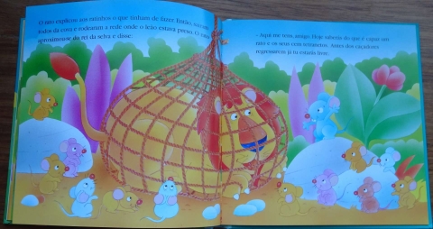 Mais tarde, o leão é apanhado numa rede e o rato, ouvindo os rugidos, vai ao seu encontro.
