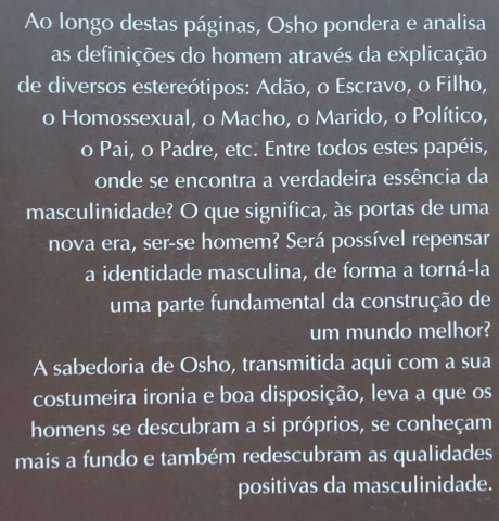 Ao longo destas páginas, Osho pondera e analisa as definições do homem através da explicação de diversos estereótipos: Adão, o Escravo, o Filho, o Homossexual, o Macho, o Marido, o Político, o Pai, o Padre, etc. Entre todos estes papéis, onde se encontra a verdadeira essência da masculinidade? O que significa, ás portas de uma nova era, ser-se homem? Será possível repensar a identidade masculina, de forma a torná-la uma parte fundamental da construção de um mundo melhor?.