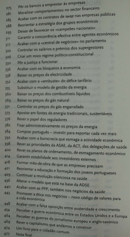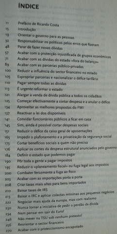 Mais que um programa de governo, é uma exposição dos vícios financeiros, económicos e políticos que tornaram Portugal insustentável. É uma listagem de todos os esquemas que precisam de acabar que serviram para enriquecer grupos empresariais e banca à sombra de uma fachada de benefícios fictícios e de bem-estar para o povo a curto prazo. É uma denúncia do mal e receitas para a sua cura, nem todas agradáveis, mas necessárias segundo um autor que as apresenta de uma forma isenta. Todos deveriam ler este livro para compreender o País que se criou.