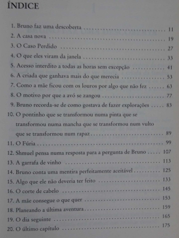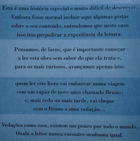 Esta é a historia de amizade entre dois meninos Bruno e Shmuel, Bruno menino alemão filho do general alemão e Shmuel, o menino magrinho e com uma cara triste, que estava num campo de concentração. Uma bonita história de amizade com um final inesperado e triste.