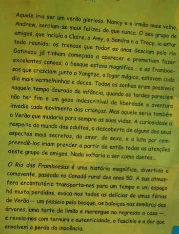 Aquele iria ser um verão glorioso. Nancy e o irmão mais velho, Andrew, sentiam-se mais felizes do que nunca. O seu grupo de amigos, que incluía a Claire, a Amy, a Sandra e a Tracy, ia estar todo reunido; os troncos que todos os anos desciam pelo rio Gatineau já tinham começado a aparecer e prometiam ser excelentes canoas; o bosque estava magnífico...e as framboesas que cresciam junto a Yangtze, o lugar mágico, estavam cada dia mais vermelhinhas e doces. Todos os sonhos eram possíveis naquele tempo dourado da infância, quando as tardes pareciam não ter fim e um gozo indescritível de liberdade e aventura invadia cada movimento das crianças. A curiosidade a respeito do mundo dos adultos, a descoberta de alguns dos seus aspectos mais secretos, do amor, do sexo, e a luta por compreendê-los iriam prender a partir de então todas as atenções deste grupo de amigos. Nada voltaria a ser como dantes «O Rio das Framboesas» é uma história magnífica, divertida e comovente, passada no Canadá rural dos anos 50. A sua atmosfera de mágico enlevo transporta-nos para um tempo e um espaço há muito perdidos, evoca-nos todas as delícias de umas férias de Verão - um passeio pelo bosque, os baloiços nas sombras das árvores, uma tarte de limão e merengue no regresso a casa e um refrescante copo de limonada -, revela-nos com ternura e autenticidade, o fascínio e a dor que envolvem a perda da inocência.