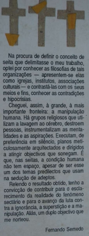 Relendo o resultado obtido, tenho a convicção de contribuir para o esclarecimento da realidade do fenómeno sectário e para o avanço da luta contra a ignorância, a superstição e a manipulação. Aliás, um duplo objectivo que me norteou,