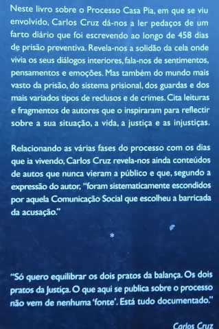 Neste livro sobre o processo Casa Pia em que se viu envolvido, Carlos Cruz dá-nos a ler pedaços de um farto diário que foi escrevendo ao longo de 458 dias de prisão preventiva. Revela-nos a solidão da cela onde vivia os seus diálogos interiores, fala-nos de sentimentos, pensamentos e emoções. Mas também o mundo mais vasto da prisão, do sistema prisional, dos guardas e dos mais variados tipos de reclusos e de crimes. Cita leituras e fragmentos de autores que o inspiraram para refletir sobre a sua situação, a vida, a justiça e as injustiças.