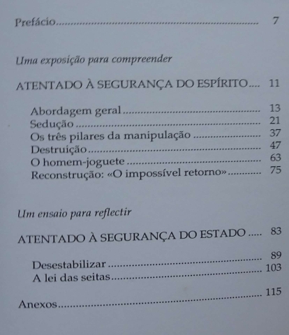 Num tempo de falência das nossas instituições políticas, económicas e jurídicas e talvez por isso mesmo o fenómeno «seitas» toma uma grande importância. As seitas representam a expressão de um desvio relativamente ignorado por toda a gente. O objetivo deste livro é considerar o problema tal como o apresenta a sua definição e responder a algumas ideias feitas que as pessoas possuem em relação às seitas, na esperança de suscitar perguntas e investigações. O perigo não é que uma seita tome o poder, mas que o pensamento criador seja, de algum modo, corrompido ou limitado. Síntese fascinante e indispensável a todos os que se interessam pelo fenómeno religioso ou para-religioso.
