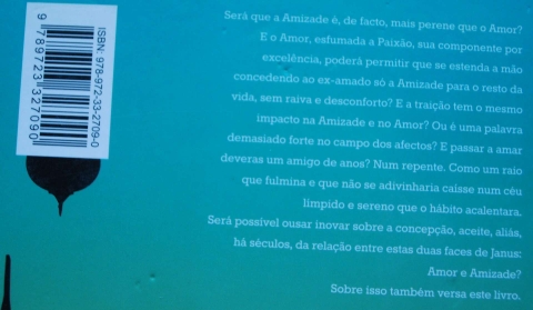 Este romance tem como tema dominante o amor e a amizade. As personagens são agarradas num bailado entrecruzado de sentimentos confusos, novos mas aliciantes, que os envolvem a todos. Uma trama apaixonante. Será que a Amizade é, de facto, mais perene que o Amor? E o Amor, esfumada a Paixão, sua componente por excelência, poderá permitir que se estenda a mão concedendo ao ex-amado só a Amizade para o resto da vida, sem raiva e desconforto? E a traição tem o mesmo impacto na Amizade e no Amor? Ou é uma palavra demasiado forte no campo dos afectos? E passar a amar deveras um amigo de anos? Num repente. Como um raio que fulmina e que não se adivinharia caísse num céu límpido e sereno que o hábito acalentara. Será possível ousar inovar sobre a concepção, aceite, aliás, há séculos, da relação entre estas duas faces de Janus: Amor e Amizade? Sobre isso também versa este livro.