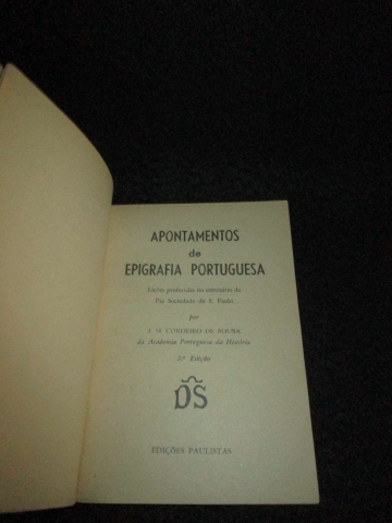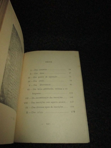 Carimbo de Biblioteca. Lições proferidas no seminário da Pia sociedade de S. Paulo. Capa de brochura. A obra apresenta um estudo sistemático dos caracteres, datas, sinais, abreviaturas, letras geminadas e métodos de reconstituição epigráfica, complementado por um conjunto significativo de foto‑gravuras.