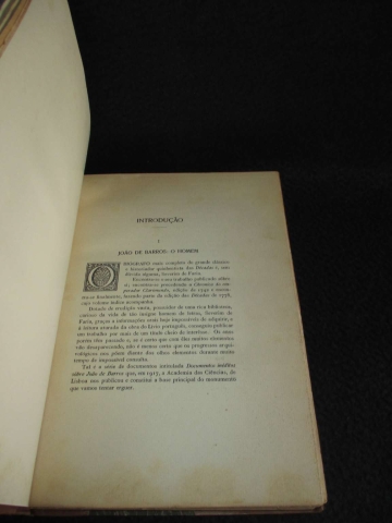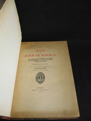 Dos feitos que os portugueses fizeram no descobrimento e conquista dos mares e terras do Oriente. Primeira década. Quarta edição revista e prefaciada por António Baião. Encadernação com lombada e cantos em pele. Título e ferros gravados a ouro na lombada. Preserva vinheta da Livraria Olisipo, Lisboa.