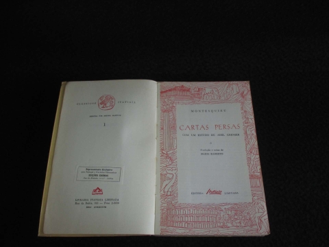 Com um estudo de Abel Grenier. Assinatura de posse. Capa de brochura. Tradução e notas de Mário Barreto. Charles-Louis de Secondat, o barão de Montesquieu, foi um político e filósofo iluminista francês, célebre por sua Teoria da separação dos poderes, a qual é encontrada na Constituição de muitos países da modernidade. 'Cartas persas' foi publicada por Montesquieu em 1721. É um relato, em forma epistolar, da estada de dois persas em Paris, na época do reinado de Luís XIV. Por meio dos personagens Usbek e Rica, os dois persas, o autor faz a crítica das instituições políticas, dos costumes e da Igreja da França de seu tempo.