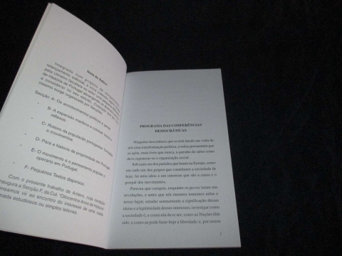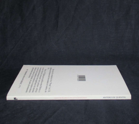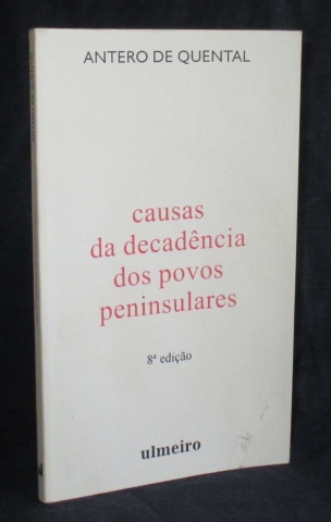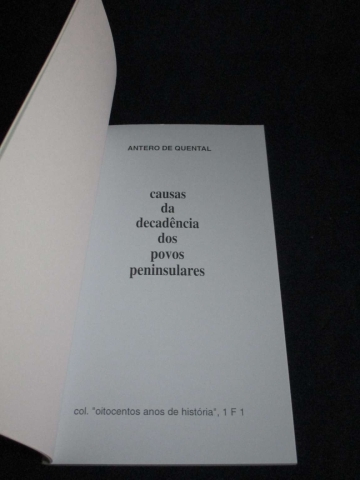 Capa de brochura. Discurso pronunciado na noite de 27 de Maio na Sala do Casino Lisbonense. "Meus Senhores: A decadência dos povos da Península nos três últimos séculos é um dos factos mais incontestáveis, mais evidentes da nossa história: pode até dizer-se que essa decadência, seguindo-se quase sem transição a um período de força gloriosa e de rica originalidade, é o único grande facto evidente e incontestável que nessa história aparece aos olhos do historiador filósofo. Como peninsular, sinto profundamente ter de afirmar, numa assembleia de peninsulares, esta desalentadora evidência. Mas, se não reconhecermos e confessarmos francamente os nossos erros passados, como poderemos aspirar a uma emenda sincera e definitiva? O pecador humilha-se diante do seu Deus, num sentido acto de contrição, e só assim é perdoado. Façamos nós também, diante do espírito de verdade, o acto de contrição pelos nossos pecados históricos, porque só assim nos poderemos emendar e regenerar." Antero de Quental