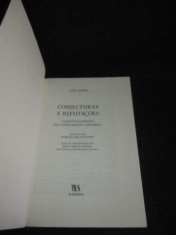 O desenvolvimento do conhecimento científico. Capa de brochura. Tradução de Benedita Bettencourt. Nota de apresentação por João Carlos Espada. "Muitos amigos de Sir Karl Popper e muitos estudiosos da sua obra consideram o presente livro, Conjecturas e Refutações (originalmente publicado em inglês, em 1963), a melhor introdução ao pensamento do autor. Encontro-me entre os subscritores desse ponto de vista [...]
