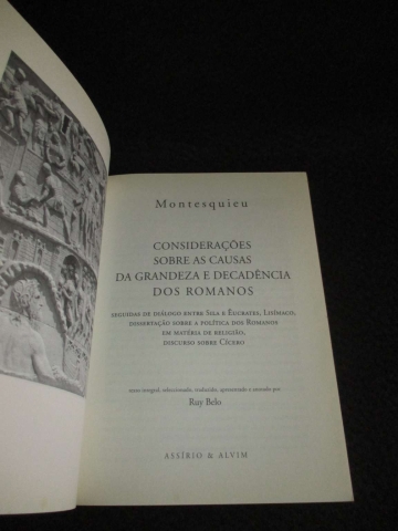 Seguidas de diálogo entre Sila e Êucrates, Lisímaco, dissertação sobre a política dos romanos em matéria de rebelião, discurso sobre Cícero. Texto integral, seleccionado, traduzido, apresentado e anotado por Ruy Belo. Capa de brochura. A edição deste livro de Montesquieu, filósofo precursor da Revolução Francesa, em Portugal tem uma história curiosa. A obra esteve para ser editada no nosso país em 1784, foi mesmo anunciada pelo livreiro francês Francisco Rolland, que se fixara em Lisboa, mas nunca chegou a ver a luz do dia. Dois séculos mais tarde, o poeta Ruy Belo traduziu, apresentou e anotou estas "Considerações", seguidas de ‘Diálogo entre Sila e Êucrates’, ‘Lisímaco’, ‘Dissertação sobre a política dos romanos em matéria de religião’ e ‘Discurso sobre Cícero’, que se esgotaram rapidamente. Aí estão, volvidos 30 anos, finalmente reeditadas.